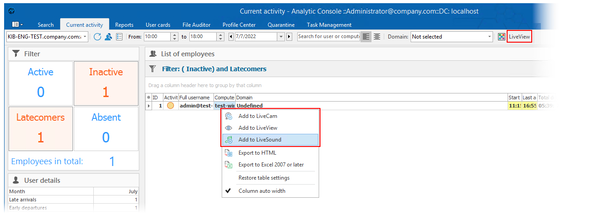 Livetime monitoring: To go to the modes of real-time control, click the LiveView button or use the context menu commands. To monitor a user in real time, select the user in the list and execute the context menu commands